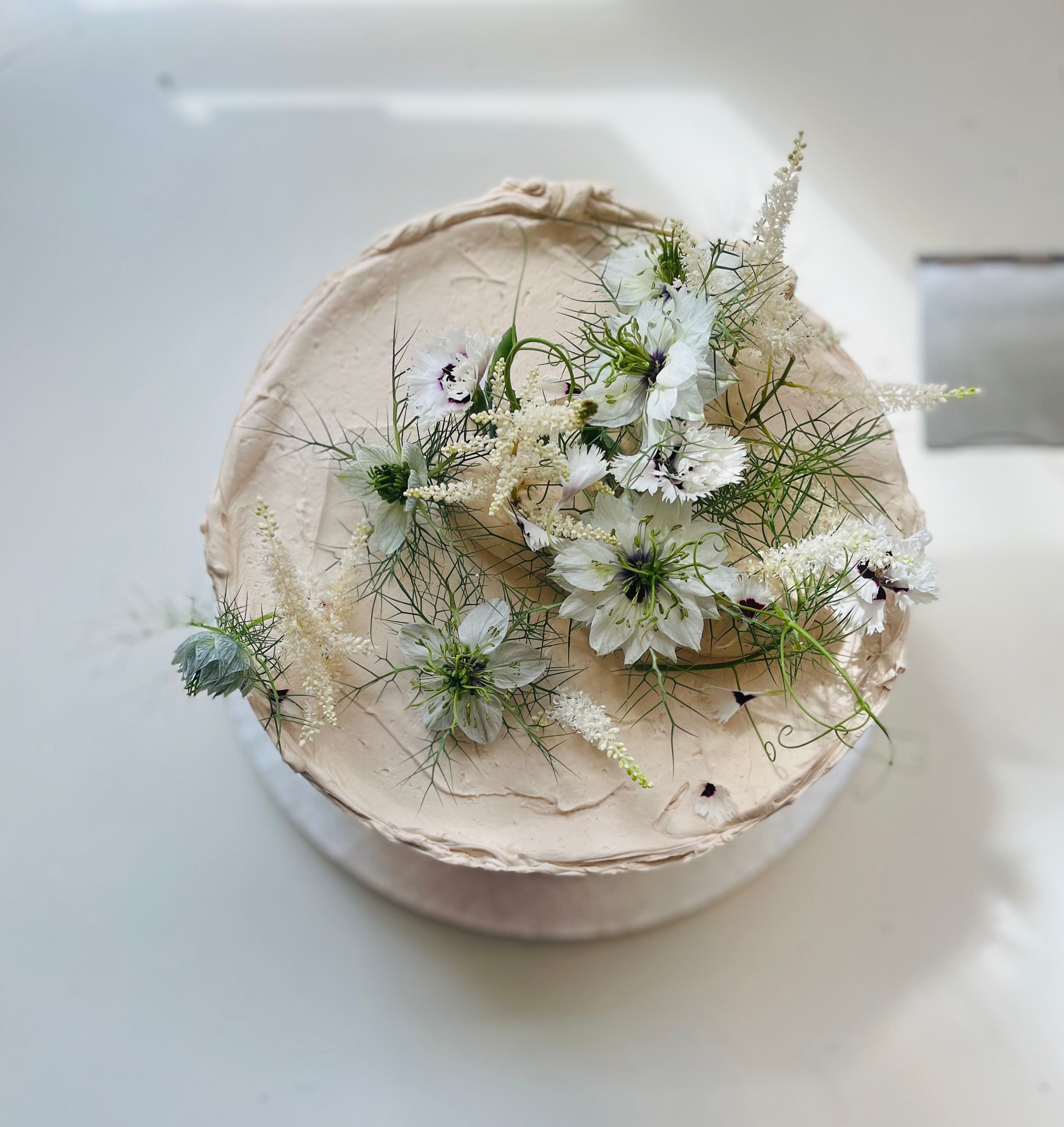 Finished with caramel Swiss butter frosting and seasonal flowers.